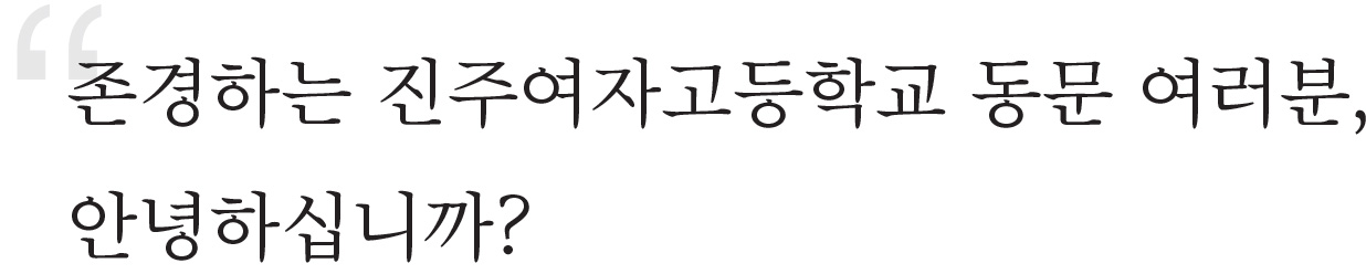 먼저, 모교의 영광스러운 100년 역사를 함께하고 있는 진주여고 동문으로서, 깊은 자긍심과 감사의 마음을 전합니다.
